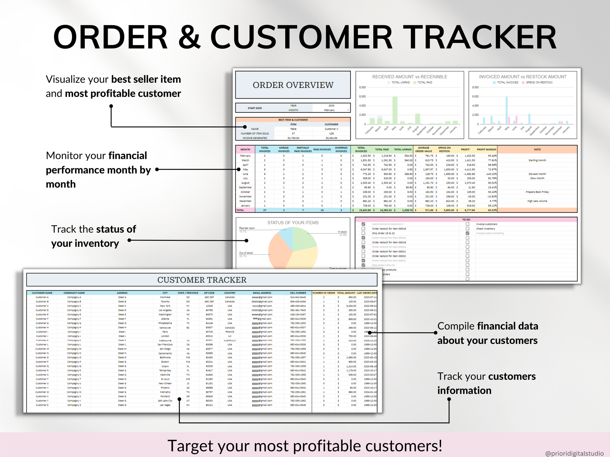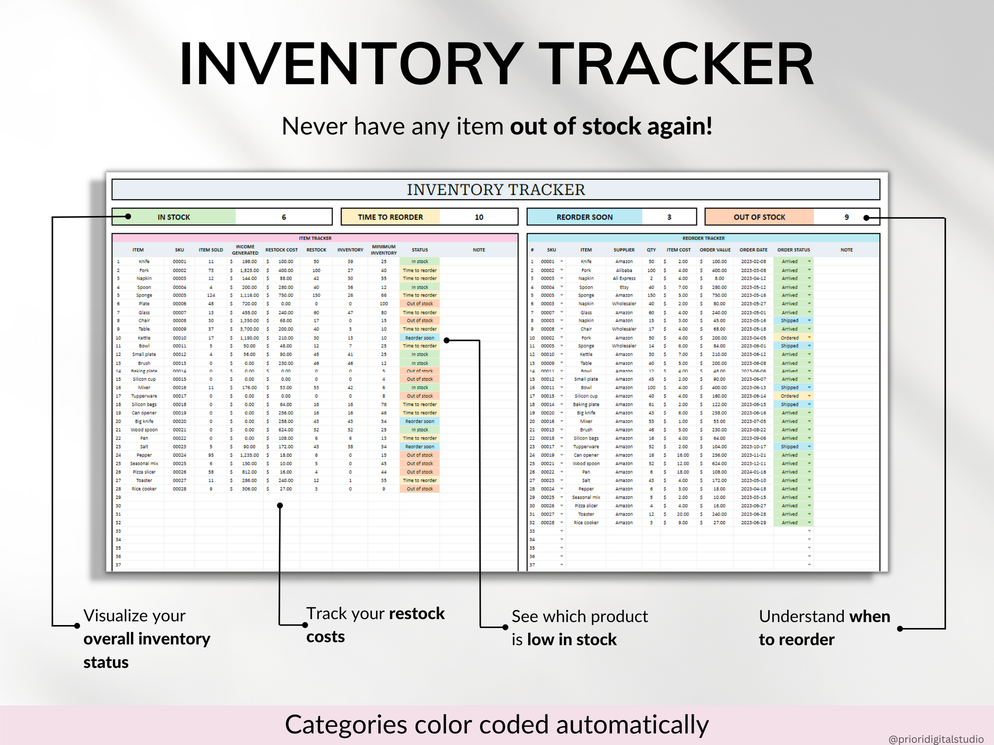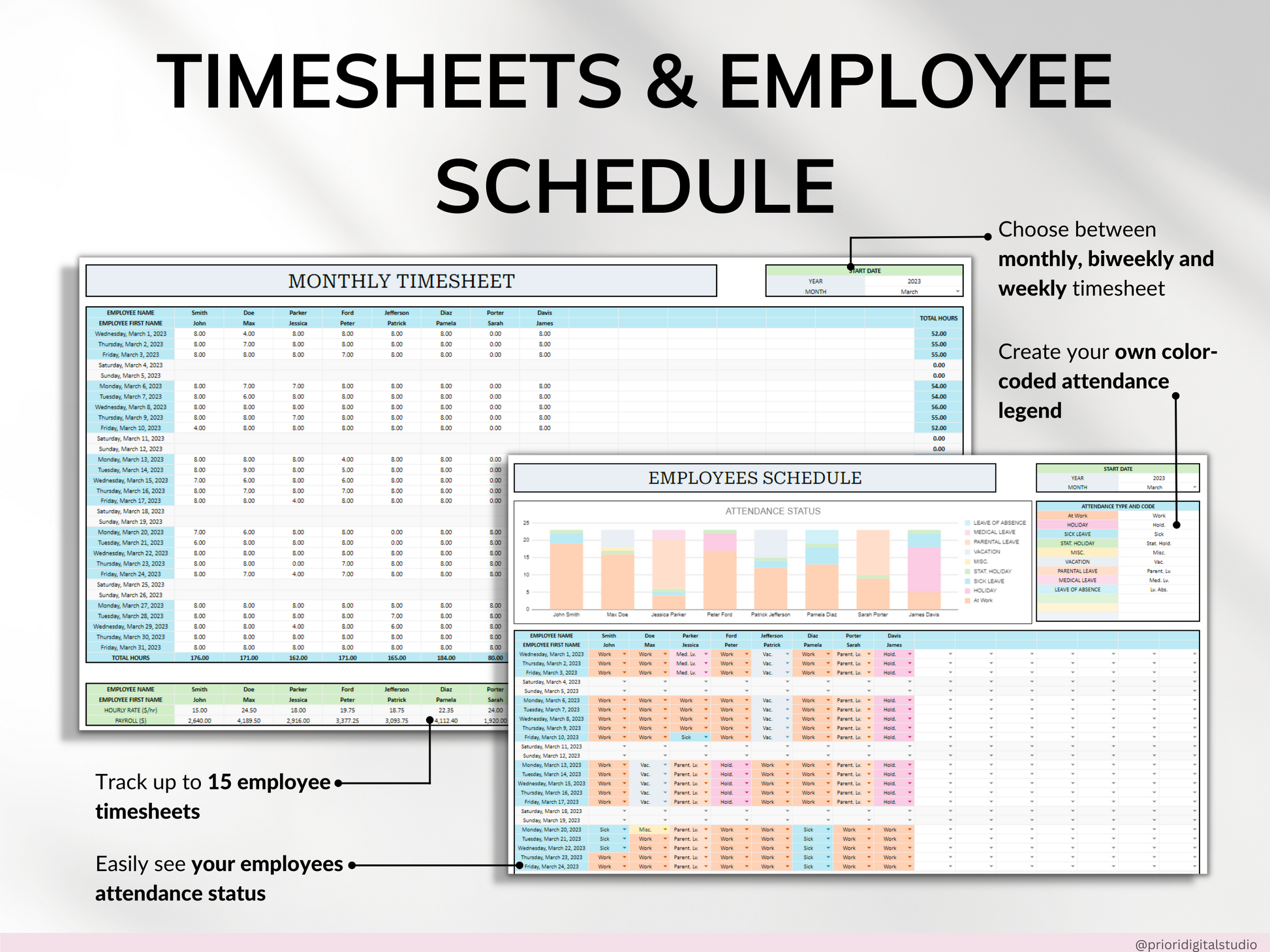 Our Service Based Small Business Bundle Spreadsheet is perfect to track your employee timesheets, manage your finances, maintain control over your inventory, and monitor your orders effectively.